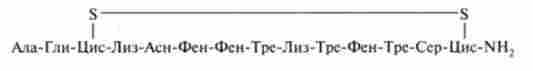 Соматостатін має більш складну структуру; він складається з 14 амінокислотних залишків, причому ланцюг стабілізована дисульфідній зв'язком: