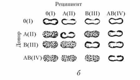 У крові кожної людини існує певна специфіка еритроцитарних агглютиногенов. В даний час їх виділено досить багато (до 30), що визначає до 300-500 млн різних комбінацій результатів переливання крові. Все це ускладнює процес переливання. На щастя, антигенні властивості більшості еритроцитарних антигенів виражені слабо, так що при переливанні крові ними можна знехтувати. Найбільший ефект при переливанні крові дає система АВ0 і резус-фактор. В системі АВ0 існує чотири групи крові: 0, А, В і АВ (рис. 8.16; табл. 8.3).