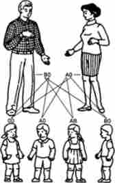поділ групи крові використовується в судовій медицині для підтвердження батьківства. Так, чоловік з IV групою крові (АВ) не може бути батьком дитини з групою О (рис. 8.18).