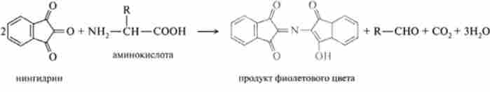 Здатність амінокислот вступати в хімічні реакції залежить від реакционноспособна відповідних угруповань. Моноаміномонокар- бонові амінокислоти вступають в реакції, характерні для їх амінних і карбоксильних груп. Інші амінокислоти, наприклад цистеїн, крім того, вступають в реакції, характерні для сульфгідрильних груп (-SH), тирозин - * в реакції фенольной групи і т. Д. Однією з найбільш характерних реакцій аміногрупи є її взаємодія з нингидрином: