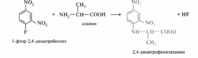 Велике значення для визначення амінокислот в білках і пептидах, зокрема кінцевих амінокислотних залишків, має їх реакція з 1-фтор-2,4-динітробензол: