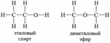 Під дією світла хлор С1г, реагуючи з етиловим спиртом, заміщає 5, а з ефіром - 6 атомів водню. Натрій заміщає в спирті один атом водню, а з ефіром не взаємодіє. На основі таких дослідів можна зробити висновок, що 5 атомів водню спирту і 6 атомів водню ефіру пов'язані з вуглецем, а один атом водню спирту пов'язаний з киснем. Молекули мають однакове число атомів С, Н і О, але розрізняються становищем атома кисню О. Це призводить до вельми різних властивостей речовин-ізомерів.