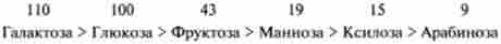 Моносахариди, які утворюються в результаті послідовної дії амілолітичних ферментів, з високою ефективністю, але абсолютно різними швидкостями всмоктуються в кров. За зменшення швидкості всмоктування моносахариди можна розташувати в наступному порядку (прийнявши умовно швидкість всмоктування глюкози за 100):