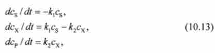 Аналіз рішення системи (10.13) показує, що швидкість перетворень складних послідовних реакцій визначається найбільш повільної стадією. Істотно, що рішення системи (10.13) може служити математичною моделлю кінетики найрізноманітніших біологічних перетворень.