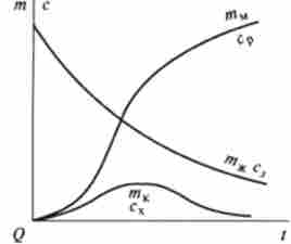 Інтегрування системи рівнянь (10.13) дає рішення у вигляді залежності концентрацій з $, з, ср від часу. Графіки цих залежностей, т. Е. Кінетичні криві, наведені на рис. 10.4. Вони відображають найбільш характерні особливості послідовних реакцій. Концентрація cs вихідного субстрату монотонно зменшується з часом. Концентрація сх интермедиата спочатку зростає, досягає максимуму, потім падає. Концентрація ср кінцевого продукту монотонно зростає з часом.
