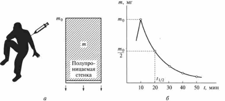 Фармакокінетика широко використовує прийоми математичного моделювання, добре відомі з біологічної кібернетики. Найбільш простою моделлю організму з введеної в нього дозою ліки є посудину з розчином цих ліків (рис. 10.6, а). Обсяг судини можна вважати приблизно рівним обсягом рідкої середовища організму, в середньому близько 7,5 л. Одна зі стінок посудини напівпроникна: пропускає назовні лікарська речовина і не пропускає розчинник. Так моделюється система виведення речовини з організму. Передбачається, що швидкість виведення описується законом першого порядку, т. Е. Пропорційнамасі речовини т в організмі в даний момент:
