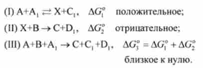 Реакція (I) оборотна. Звідси випливає, що, хоча енергія Гіббса AG,0 цієї реакції позитивна, чисельне значення AG, ° невелика. Тому в системі є невелика кількість интермедиата X. Цей интермедиат вступає в термодинамічно вигідну реакцію (II) з AG? <0. Таким чином, за X конкурують зворотна реакція (I) і реакція (II). Оскільки реакція (II) вигідна, може йти ефективну освіту продукту С. який в прямій реакції А + В = С не утворюється внаслідок позитивного значення AG ° цієї реакції.