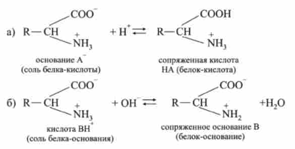 4. Іони і молекули амфолітов. До них відносять амінокислотні і білкові буферні системи. Якщо амінокислоти або білки знаходяться в ізоелектричному стані (сумарний заряд молекули дорівнює нулю), то розчини цих сполук не є буферними. Вони починають проявляти буферне дію, коли до них додають деяку кількість кислоти або лугу. Тоді частина білка (амінокислоти) переходить з ізоелектричного стану в форму «білок-кислота» або відповідно до форми «білок-підставу». При цьому утворюється суміш двох форм білка: а) слабка «білок-кислота» + сіль цієї слабкої кислоти; б) слабке «білок-підставу» + сіль цього слабкої основи: