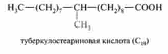 Поряд з насиченими і ненасиченими жирними кислотами з лінійної ланцюгом вуглецевих атомів в природі зустрічаються жирні кислоти з розгалуженою ланцюгом. Зокрема, до них відноситься туберкулостеаріновая кислота, виділена з туберкульозної палички: