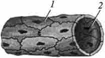 / - ендотеліальна клітина; 2 - просвіт капіляра ють мережу, з якої формуються лімфатичні судини. У будові лімфатичних судин є багато спільного з венами. Це пояснюється схожістю лімфо і гемодинамічних умов функціонування цих судин: наявністю низького тиску і напрямком струму рідини від органів до серця.