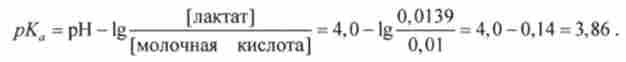 Приклад 1. обчислити рКа молочної кислоти, якщо pH розчину, в 1 л якого міститься 0,01 моль молочної кислоти і 0,0139 моль лактат-іона (аніон молочної кислоти), дорівнює 4,0.