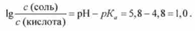 Приклад 2. Обчислити співвідношення концентрацій CHjCOONa і СН3СООН в буферному розчині, щоб pH дорівнював 5,8 (рКл для СН3СООН дорівнює 4,8). Відповідно до рівнянням Гендерсона-Гассельбаха (8.11)