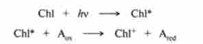 У 50-х рр. XX століття Р. Емерсон припустив, що залежна від світла фаза фотосинтезу містить дві окремі фотосистеми, причому обидві вони повинні активуватися для досягнення максимальної ефективності світлових реакцій. Фотосистема I (ФС I) містить в основному хлорофіл а, поглинає при 700 нм, а фотосистема II (ФС II) - при 680-683 нм. Багато деталей світлових реакцій невідомі. Встановлено, що обидві фотосистеми виконують окремі, але взаємодоповнюючі функції. Поглинання кванта світла ФС I переводить хлорофіл-700 в електронно-збуджений стан, в ньому відбувається поділ зарядів за рахунок присутності поруч з порушеною хлорофілом допоміжних пар: окислювач-відновник. Оскільки їх природа невідома, відновлений акцептор на рис. 16.2 позначений А ^. При цьому збуджений хлорофіл перетворюється в катіон-радикал, т. З. в його молекулі утворюється «електронна дірка» за схемою: