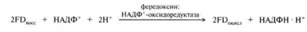 де Chi, Chi *, Chl+ - молекули хлорофілу в основному, електрон но-збудженому і катіон-радикальному станах. Високоенергетичні електрони з Ared, утвореного в ФС1, відновлюють железосерний негемове білок ферредоксин, який бере участь у відновленні НАДФ * таким чином, що НАДФ Н відразу надходить в строму. В реакції відновлення НАДФ 'ферредоксин (FD) бере участь ФАД-залежна дегидрогеназа - ферредоксин: НАДФ'-оксидоредуктаза: