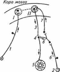 / - центр безумовного подразника; II - центр умовного подразника; I- 3 4 5-дуга безумовного слюноотделительного рефлексу; 2- 6- 4- 5 і 2- 6- 7-3- 4-5 - дуги умовного слюноотделительного рефлексу. пунктир - тимчасова нервовий зв'язок