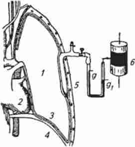 / - легкі; 2-серце, 3 плевра; - / - діафрагма; 5голка; б-кімограф; $ - рівні ртуті, що показують негативний тиск в грудній порожнині