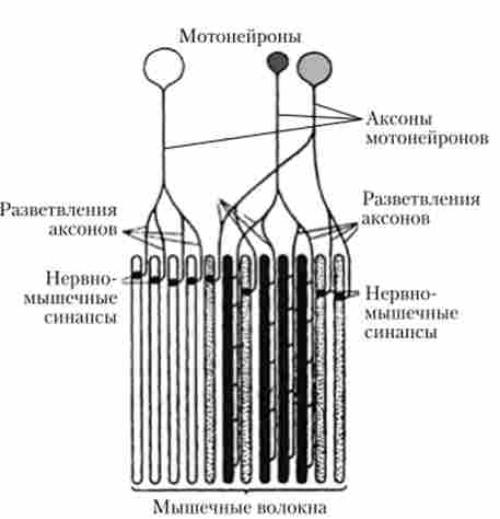 чноё) і перехідні. Рухові одиниці кожного м'яза неоднакові. М'язи, що забезпечують точні і швидкі рухи (наприклад, м'язи пальців руки), складаються в основному з декількох сотень або тисяч швидких рухових одиниць. У більшості м'язів змішаного типу першими активізуються повільні рухові одиниці, розвиваючі