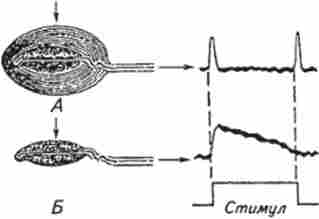 А. Интактное тільце Пачіно. На початок і кінець роздратування генерується короткочасний деполяризационного рецепторний потенціал Б. У тільця Пачіно механічно видалені зовнішні шари капсули. На механічний стимул генерується більш тривалий рецепторний потенціал