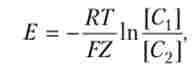 де Е - величина потенціалу, що виникає між розчинами, налитими в посудину 1 і посудину 2; R - газова постійна; Т - температура; F - число Фарадея; Z - валентність; [З{ - концентрація іонів К+ в посудині 1; [З2] Концентрація іонів К+ в посудині 2.