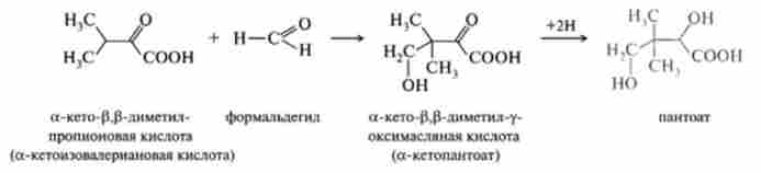 Пантотенова кислота синтезується в мікробних і рослинних клітинах, і в залежності від типу клітин умови її біосинтезу можуть відрізнятися. У клітинах Е. coli синтез вітаміну В3 протікає в такий спосіб: