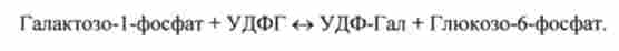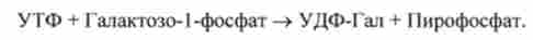 Галактозо-1-фосфат реагує з УДФГ і утворюється УДФ-Гал (на кофермент глюкоза замінюється галактозою):