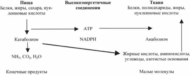 Взаємозв'язок загального катаболізму (розщеплення) і анаболізму (синтезу) представлена на наступній схемі: