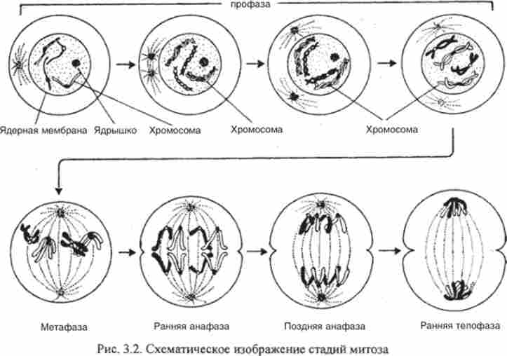 Представлений коротко загальний хід мітозу, характерний для клітин тварин і рослин. Деякі відмінності від цього процесу зустрічаються, наприклад, у грибів (почкующиеся дріжджі-сахароміцети), у яких весь мітоз проходь! ' всередині ядерної мембрани, що зберігається на всіх стадіях, а ахроматинового веретено формується всередині ядра.