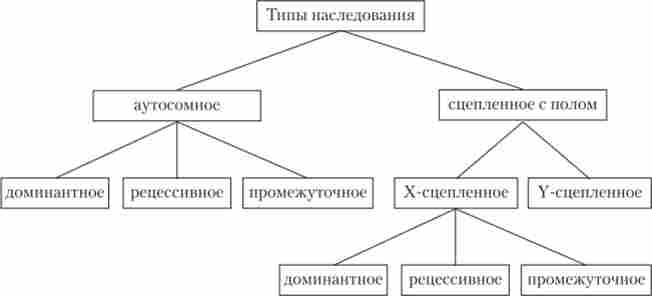 У зв'язку з тим що каріотип організму - це диплоїдний набір хромосом, більшість генів в соматичних клітинах представлені аллельними парами. Алельних гени, розташовані у відповідних ділянках гомологічних хромосом, взаємодіючи між собою, визначають розвиток того чи іншого варіанту відповідної ознаки (див. Розд. 3.6.5.2). Будучи специфічною характеристикою виду, каріотип представників різної статі різниться по парі статевих хромосом (див. Розд. 7.1.2.1). Гомогаметний підлогу, що має дві однакові статеві хромосоми XX, діплоїден по генам цих хромосом. Гетерогаметний підлогу має одинарний набір генів Х-хромосоми (ХО) або негомологічних ділянок X- і Y-хромосом. Фенотипічніпрояв і успадкування окремих ознак з покоління в покоління організмів залежить від того, в яких хромосомах розташовуються відповідні гени і в яких дозах вони присутні в генотипах окремих особин. Розрізняють два основних типи успадкування ознак: аутосомное і зчеплене з підлогою (Схема 7.1).