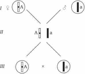II - диплоїдний генотип особини (фенотип залежить від взаємодії алельних генів Аа); III - гаплоїдні гамети гетерозиготною особини (гамети «чисті», так як несуть по одному з пари алельних генів); чорним і білим позначені гомологічні хромосоми; буквами - певні локуси