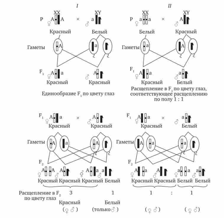 Х-зчеплений рецесивний ознака (Білий колір очей у дрозофіли) у самок проявляється тільки при отриманні ними відповідного алеля від обох батьків (ХаХа). У самців XaY він розвивається при отриманні рецесивного алеля від матері. Рецесивні самки передають рецесивний аллель нащадкам будь-якої статі, а рецесивні самці - тільки «дочкам» (див. Рис. 7.8).