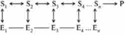 Нижче представлена схема, яка зображує Мультиферментний систему, в якій продукт останньої реакції є негативним ефектором аллостерічного ферменту Е ,: