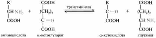 На першій стадії відбувається трансамінування амінокислоти (донор аміногрупи) з а-кетоглутаратом (акцептор аміногрупи). При дії активної трансамінази амінокислота перетворюється в кетокислоту, а а-кетоглу- Тарата - в глутамінової кислоти: