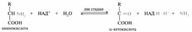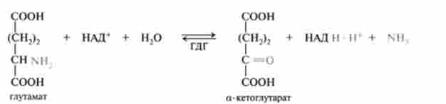На другій стадії відбувається окислювальне дезамінування глутамату при дії активної НАД+-залежною глутаматдегідрогенази (ГДГ):