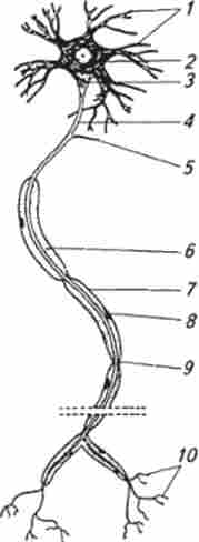/ - дендрити; 2-тіло клітини; 3 - аксонний горбок; 4 аксон; 5 - коллатераль аксона; 6 - місліновая оболонка; 7- шваннов- ська оболонка; 8- ядро шванівської клітини; 9- перехоплення ран- вье; 10 кінцеві розгалуження аксона, позбавлені мієлінової оболонки