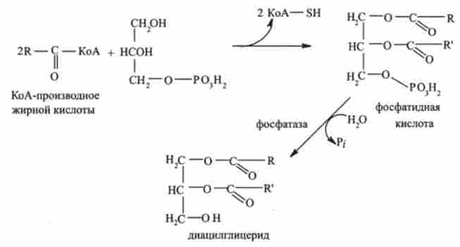 Далі від фосфатидного кислоти гидролитично отщепляется фосфорна кислота з утворенням діацілгліцерідов. У цій реакції беруть участь переважно насичені і ненасичені Cj6- і С ^ -проізводние КоА: