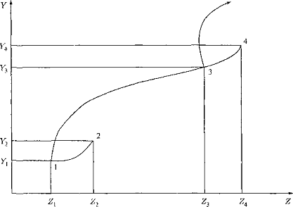У другій половині XX в. вельми модними стали розмови про прийдешню «нової цивілізації». «Нова цивілізація несе з собою нові сімейні відносини; інші способи працювати, любити і жити; нову економіку; нові політичні конфлікти, і понад те - змінене свідомість. ... Вона ... буде перекидати бюрократію, зменшувати роль національної держави, сприяти зростанню напівавт автономних економік ... Вона вимагає нових, більш простих, ефективних і демократичних урядів. Це - цивілізація зі своїм власним уявленням про світ, зі своїми власними способами використання часу, простору, логіки і причинності »(Тоф-флер, 1980, с. 31, 34). Для характеристики цієї цивілізації використовують уявлення про третій хвилі, технотронной ері, інформаційному, постіндустріальному і постекономічного суспільстві. З усіх цих уявлень найбільш вдалим і загальним нам представляється термін, введений Д. Беллом - «постіндустріальне суспільство». Його перевага полягає в прихованій в ньому потенційної альтернативності. Як було зазначено в п. 6.2, в глобальному постіндустріальному світі одні країни можуть досягти рівня інформаційного суспільства, інші - перебувати в більш примітивному стані, причому можуть бути відсутні тенденції до зменшення відмінностей між ними. Щоб краще уявити потенційне розмаїття постіндустріального суспільства, повернемося ще раз до бифуркационной схемою, що характеризує основні особливості соціоекономічної еволюції. Рис. 6 На осі У відкладаються значення сукупного доходу, на осі 2 величина трансакційних витрат, обумовлена інституційними, культурними та іншими структурними перетвореннями в суспільстві. Точки 1 і 3 є точками біфуркації, точки 2 і 4 відповідають стаціонарним станам суспільства (процес еволюції в них завершується). Положення 1 відповідає рівню доходу, якому індустріальне суспільство зобов'язане діями капіталу і праці в умовах досконалої конкуренції, що веде до усереднення норми прибутку. Неминуча обмеженість інноваційного оновлення призводить до того, що кінцевим результатом еволюції може стати стаціонарний стан 2. Це стан було описано Рікардо. Воно стійке, якщо суспільство не має достатніх ресурсів для постійного інноваційного оновлення економіки. В іншому випадку стійкої стає еволюційна траєкторія 1-gt; 3. Розміри сукупного доходу на душу населення різко зростають, передбачення Рікардо перестають виправдовуватися. Проте в стані 3, в якому панують монополії і олігополії, знову з'являється можливість переходу до стаціонарного стану, але вже при більш високому рівні сукупного доходу. По суті, це рух до «соціалістичному суспільству» в одному з його можливих варіантів (в сенсі Маркса, або в сенсі Шумпетера, або в сенсі теорії конвергенції). Це рух уздовж траєкторії 3 -> 4. Воно стійке, якщо економіка втрачає свій інноваційний потенціал. Майбутнє стає практично наперед визначеним і керованим. Темпи відбуваються в суспільстві настільки малі, що дозволяють серйозно говорити про «управлінні не тільки еволюцією, але і всім історичним процесом» (Капіца та ін, 2001, с. 9). Правда, історичний процес у власному розумінні слова при цьому перестає існувати. Навпаки, при збереженні інноваційного потенціалу в суспільстві тенденція 3 - * 4 стає нестійкою і не реалізується, роблячи прогноз Шумпетера (і Маркса) так само неправильним, як і попередній прогноз Рікард