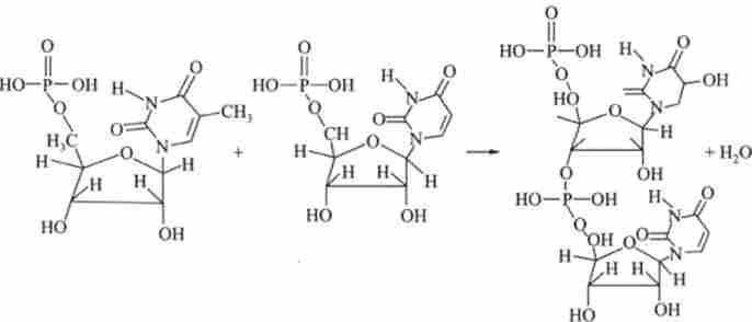 Після накопичення достатньої кількості нуклеотидів здійснюється полімеризація - з'єднання нуклеотидів в полімерну ланцюг і в кінцевому рахунку утворюється нуклеїнова кислота. Починається полімеризація з освіти димарів - динуклеотидів. Наприклад, освіту діуріділа протікає в результаті з'єднання двох нуклеотидів: