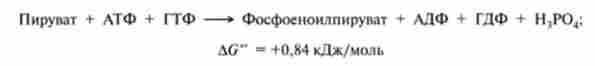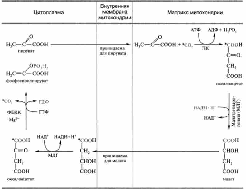 Таким чином, карбоксилирование пірувату в мітохондріях мало лише енергетичне значення, і вуглець С02 (Відзначений зірочкою) в вуглецевий ланцюг продукту реакції не включається. Стехіометричне рівняння реакції: