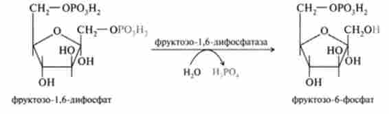 Ці реакції здійснюються високоспецифічними ферментами, гідроліз фосфоефірную зв'язок. Реакції є екзергонічеськие і не вимагають витрати енергії. Перетворення фруктозо-1,6-дифосфата у фруктозо-6-фосфат каталізується ферментом фруктозо-1,6-дифосфатази: