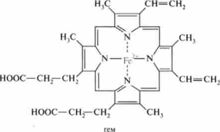 Гемоглобін здійснює перенесення кисню від легенів до різних органів, в яких протікають реакції окислення. Молекула гемоглобіну складається з двох а- і двох (5-поліпептидних ланцюгів і чотирьох гемов, з'єднаних слабкими зв'язками з глобіновой частиною (гл. 3). Гем входить до складу деяких інших білків, за своєю біохімічної функції схожих з гемоглобіном. До них відноситься миоглобин - кисневмісний білок м'язів, що складається з однієї поліпсптідной ланцюга, схожою за структурою з субодиницею гемоглобіну; цитохроми - з'єднання, що функціонують як переносники електронів в окислювально-відновних реакціях (гл. 15); каталаза і пероксидаза, каталізірующі перетворення пероксиду водню в молекулу води.