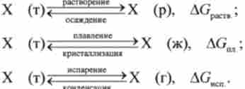 До оборотним у напрямку фізичним процесам ставляться розчинення, випаровування і плавлення речовин, а також осадження, конденсація і кристалізація речовин - процеси, їм зворотні. Такі процеси називають фазовими переходами. При цьому речовина з одного агрегатного стану (г, ж, т) переходить в інше (г, ж, т), не змінюючи свого хімічного складу.