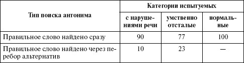 Всі діти з первинною мовною патологією мали з певними індивідуальними відмінностями III рівень недорозвинення мови (за Р. Є. Льовиній). У їх мови відзначалися специфічні для цієї категорії дітей порушення звуковимови і граматичного ладу. Вільне спілкування ще утруднено, процес пошуку потрібного слова часом затягується. Періодично виникають тривалі паузи. Для них характерний легкий аграмматізма, загострюється при спробах складно організованого висловлювання. У цих випадках спостерігаються випадки пропуску прийменників, порушення узгодження іменників і прикметників в числі, відмінку і роді, неузгодженість підлягають і присудків, іноді неправильне освіту множинного і єдиного числа імен іменників і прикметників. Зустрічається порушення наголосу в словах і т. п. Як правило, у всіх дітей з порушенням мови зустрічаються певні труднощі при вживанні синонімічних рядів і фразеологічних зворотів. Мова у обстежених розумово відсталих дітей була розвинена у всіх відношеннях краще, ніж у дітей з первинним порушенням мови. У чотирьох з них відзначалися лише негрубі фонетичні дефекти, у одного була порушена складова структура слів. У всіх в тій чи іншій мірі зустрічалися елементи аграматизму. Фраза їх досить розгорнута, хоча в цілому відрізнялася від вікової норми загальної обедненностью. Відзначалася деяка дисоціація між активним і пасивним словником, з перевагою першого. Номінатівная функція мови при називання предметів і дій у дітей обох груп досить розвинена (в межах широкої побутово-розмовної лексики). Однак у тих рідкісних випадках, коли виникали труднощі, словесних замін у дітей з порушеннями мови було в кількісному вираженні більше, ніж у розумово відсталих. У середньому на одного учня з недорозвиненням мови при називання предметів доводиться 2,6 парафазии, на розумово відсталого - 2 парафазии. Відповідно при називання дій: 2,2 і 1,7. Специфіка речемислітельного пошуку протилежного значення у дітей з недорозвиненням мови Перш ніж перейти до викладу та аналізу експериментального матеріалу, коротко охарактеризуємо методичні особливості досвіду з перебуванням протилежного значення - у його письмовому альтернативному варіанті. Як вже говорилося, гшсьменний варіант цієї методики використаний з метою виключення або суттєвого зменшення впливу на розумові процеси власне мовних труднощів у дітей з недорозвиненням мовлення. Перша особливість цього досвіду полягає в тому, що всі діти, що брали участь в ньому, були звільнені від усного (по пам'яті) пошуку антонима. Антонім в числі інших «зашумлять» слів задавався в письмовому вигляді. У зазначеній модифікації завдання в найбільш «чистому» вигляді давало навантаження на власне розумовий механізм процесу пошуку протилежного значення. Власне мовний механізм виконував тут допоміжну роль. Друга особливість досвіду - у змісті використаних альтернативних слів. Вони були спеціально підібрані таким чином, що їх значення як би моделюють внутрішні етапи речемислітельного пошуку. Цей методичний прийом спрямований на активне провокування у дітей тих чи інших проміжних речемислітельних операцій в процесі пошуку протилежного значення. Передбачалося, що діти з порушенням мови і розумово відсталі діти при виборі протилежного значення будуть виявляти недостатність речемислітельного по