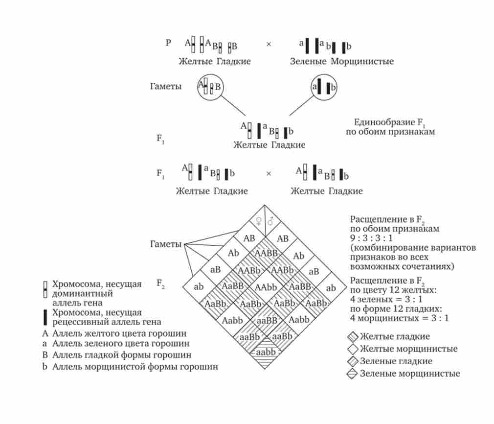 Незалежне успадкування ознак вперше було описано Г. Менделем в дослідах на горосі, коли одночасно аналізувався спадкування в ряду поколінь кількох ознак, наприклад кольору і форми горошин (рис. 7.11). Кожен з них окремо підкорявся закону розщеплення в F2. В Водночас різні варіанти цих ознак вільно комбінували у нащадків, зустрічаючись як в поєднаннях, які спостерігаються у їхніх батьків (жовтий колір і гладка форма або зелений колір і зморшкувата форма), так і в нових поєднаннях (жовтий колір і зморшкувата форма або зелений колір і гладка форма). На підставі аналізу отриманих результатів Г. Мендель сформулював закон незалежного успадкування ознак, відповідно до якого: «Різні пари ознак, що визначаються неалельних генами, передаються нащадкам незалежно один від одного і комбінуються у них у всіх можливих поєднаннях».