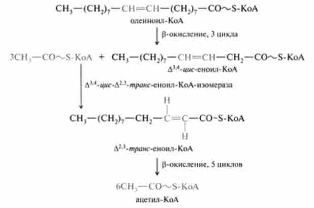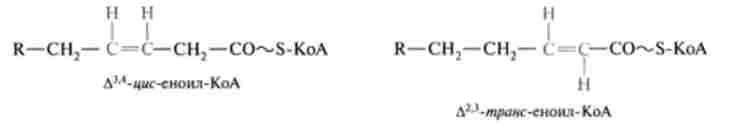 В організмі є фермент, який, по-перше, здійснює переміщення подвійного зв'язку зі становища 3-4 в положення 2-3 і, по-друге, змінює конфігурацію подвійного зв'язку з цис- в транс-, т. е. каталізує реакцію подвійний ізомеризації: Д3,4-* 4мс-Д2,3-/ Л / ю // з-еноіл-КоА-ізомсраза.