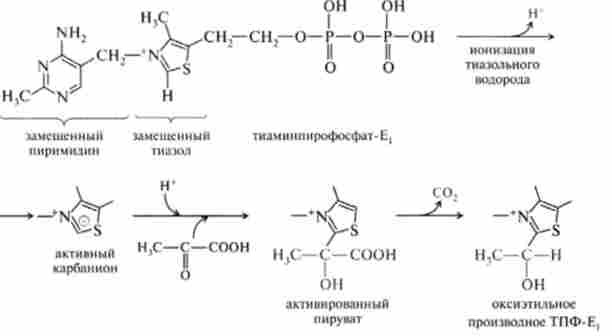 На першій стадії катализируемой ПДГ (Е,) піруват взаємодіє з коферментом цього ферменту (ТПФ), відбувається активація пірувату, його де- карбоксилирование і освіту оксіетільного похідного ТПФ-Е ,: