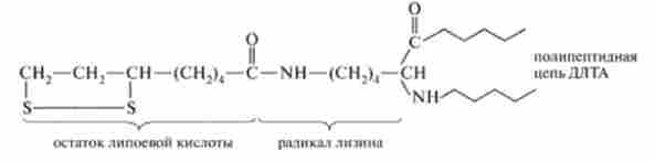 На другій стадії ДЛТА (Е2) Окисляє оксіетільную групу комплексу СН3-СНОМ-ТПФ-Е, і переносить утворюється ацетильную залишок на окислену форму ліпоєвоїкислоти - коферменту ДЛТА (Е2), Який ковалентного пептидного зв'язком приєднаний до залишку лізину пептидного ланцюга ферменту: