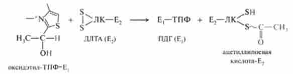 Ацетілліпоевая кислота містить активовану ацетильную групу, втіоефірной зв'язку якої кумулірованнимі енергія окисної реакції дегідрування оксіетільной групи ТПФ.