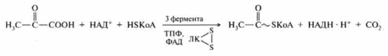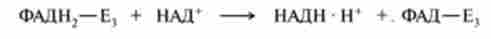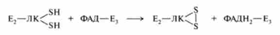 ставши відновленого комплексу Е2-Реакція каталізується ДЛДГ (Е3), Що переносить атоми водню від відновлених сульфгідрильних груп дегідроліпоевой кислоти на ФАД-кофермент даного ферменту: