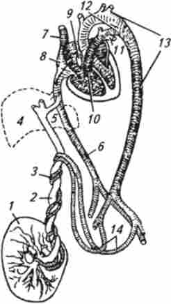 / - плацента; 2 вена від плаценти; 3 пупкові артерії від клубової артерії плода. 4-печінку; 5-венозний протока; б-задня порожниста вена; 7-передня порожниста вена; 8- праве передсердя; 9- овальний отвір між передсердями; 10 легенева артерія; // - гілки, які живлять легкі; 12 - боталлов проток; 13 - дуга аорти; 14- гілки від клубовихартерій, що переходять в пупкові артерії (густота штрихування відповідає ступеню венозности крові)