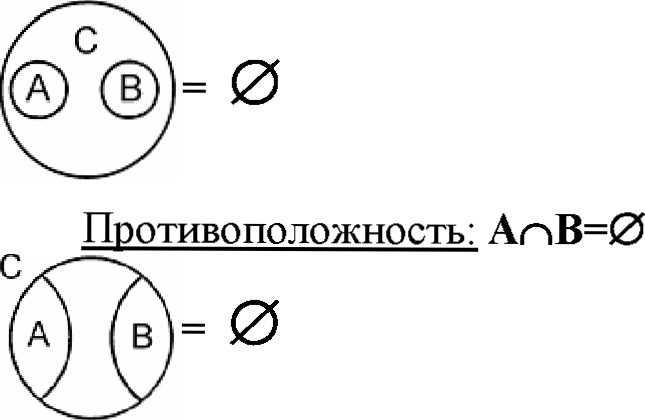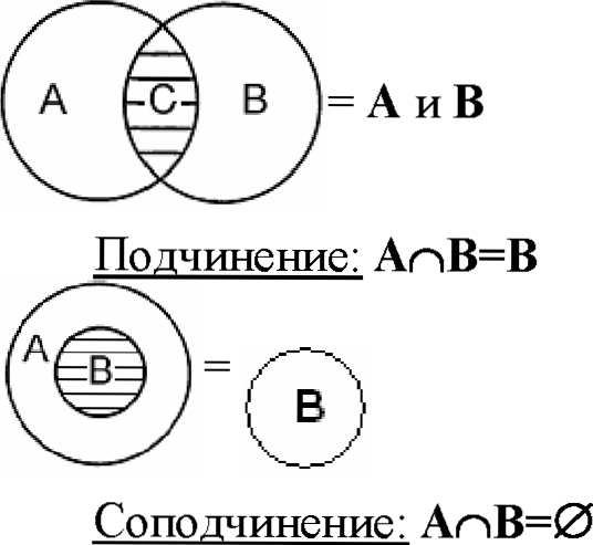 перетину класів (множення); А ', (А; ІА) - доповнення до класу А. Операції над класами ілюструються круговими схемами, універсальний клас позначається